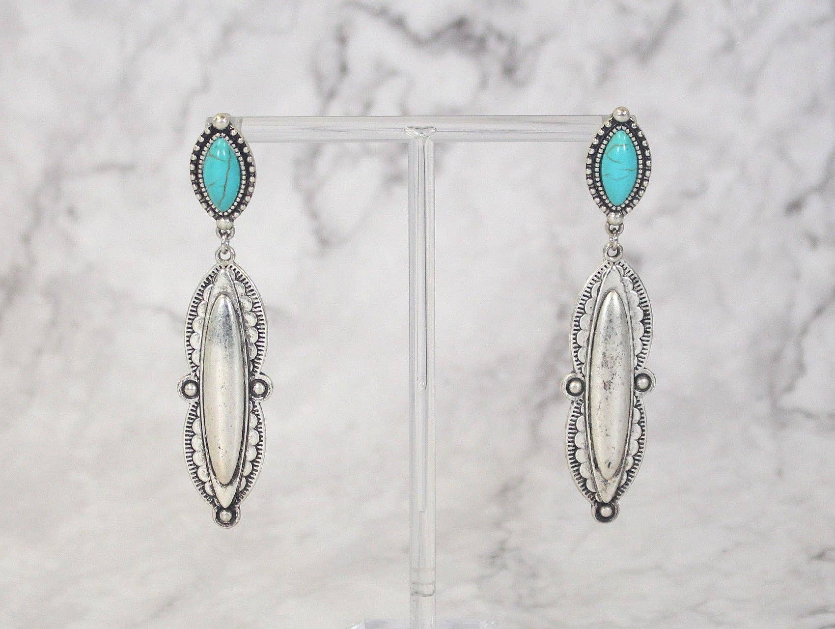 A turquoise stone top with a silver metal long oval concho dangle. Comfortable to wear all day with a post back type closure.