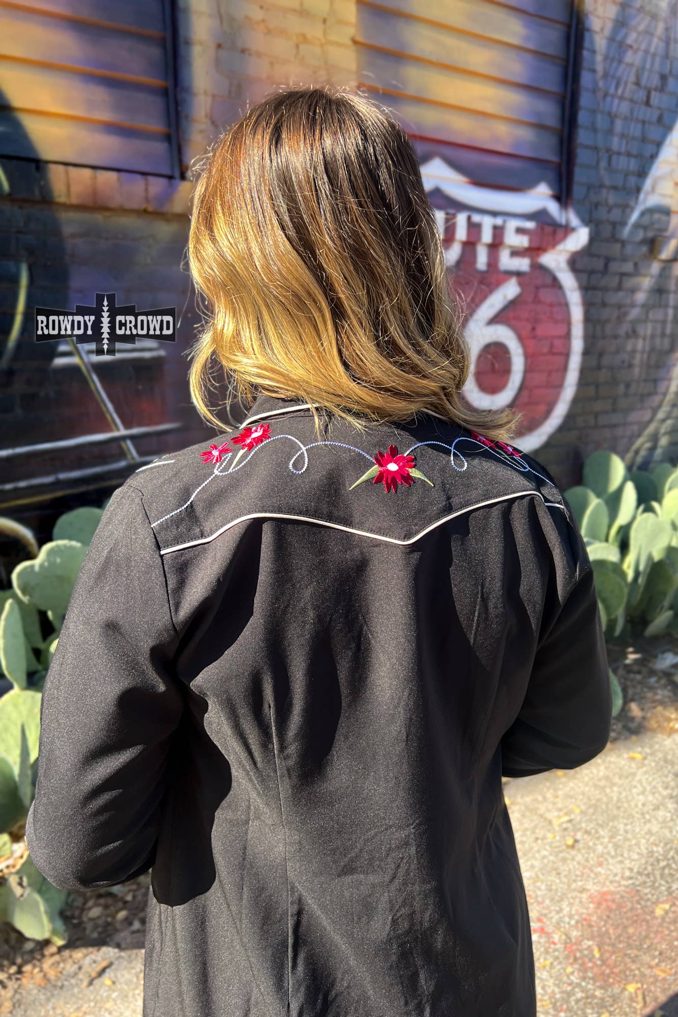 The All Dolled Up Dress features a sleek black body with black pearl snap buttons and exquisite embroidered designs. Go out in style in this beautifully detailed dress that will make you feel confident and CHIC.
