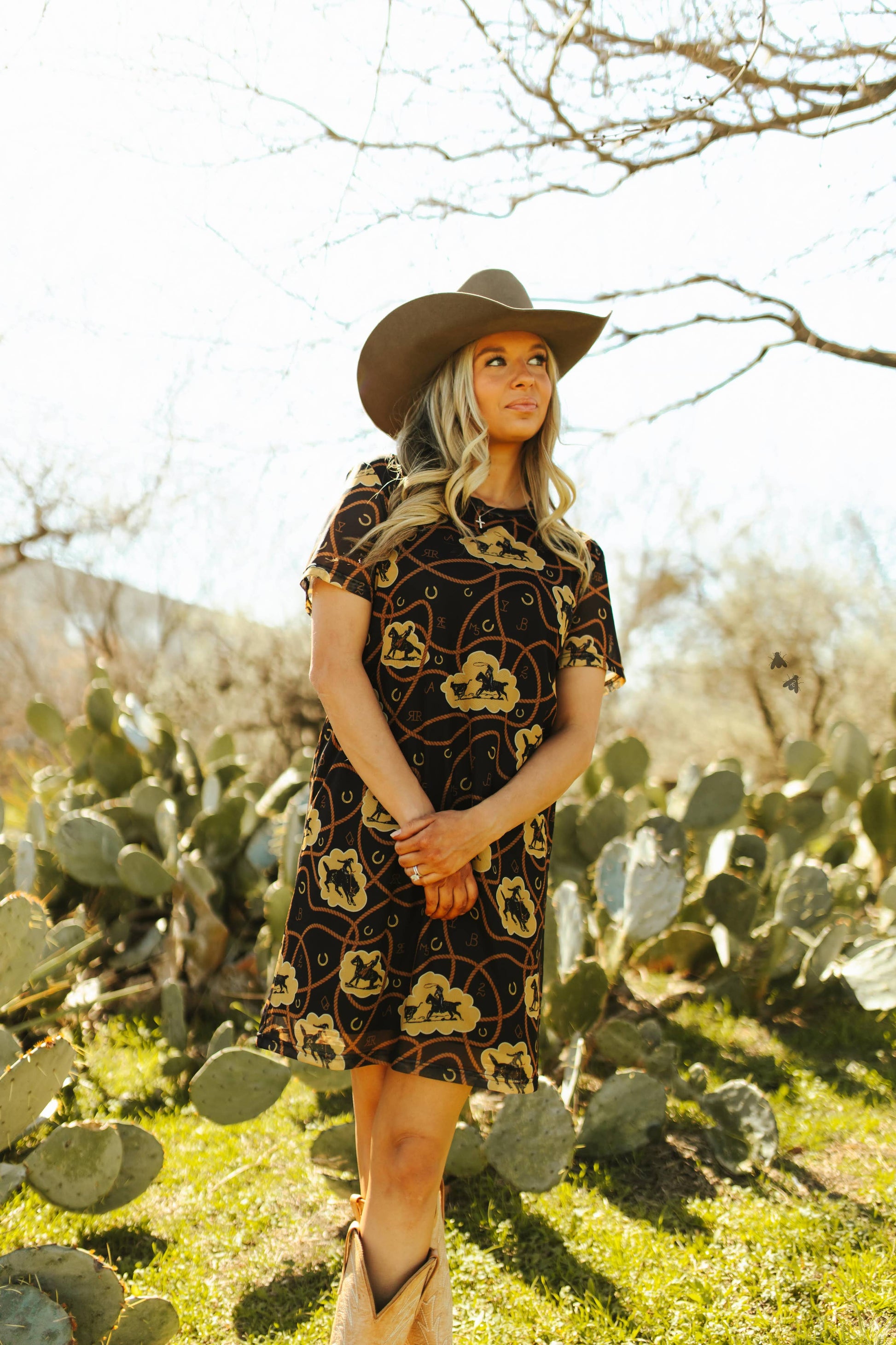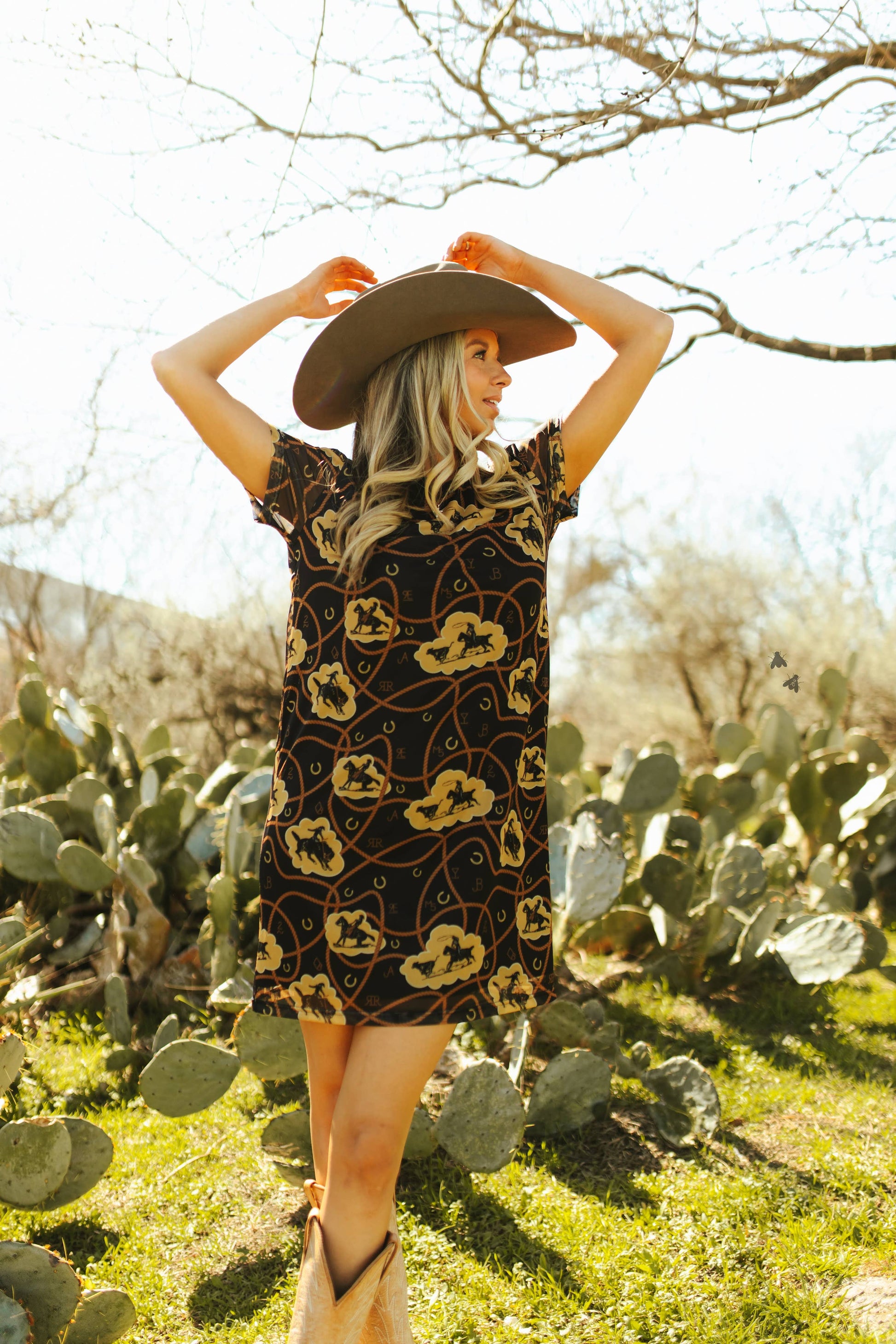 CATTLE DRIVE, a dress from 2 Fly Co, embodies the brand's unique blend of Western style and originality. This women's dress is a testament to our commitment to creating timeless pieces. The hand-drawn, original designs are crafted with an intent to stay relevant across generations, not just fleeting trends. Designed for inclusivity, it accommodates sizes XS-3X. Join us at 2 Fly Co and stay stylishly unique in our CATTLE DRIVE dress.