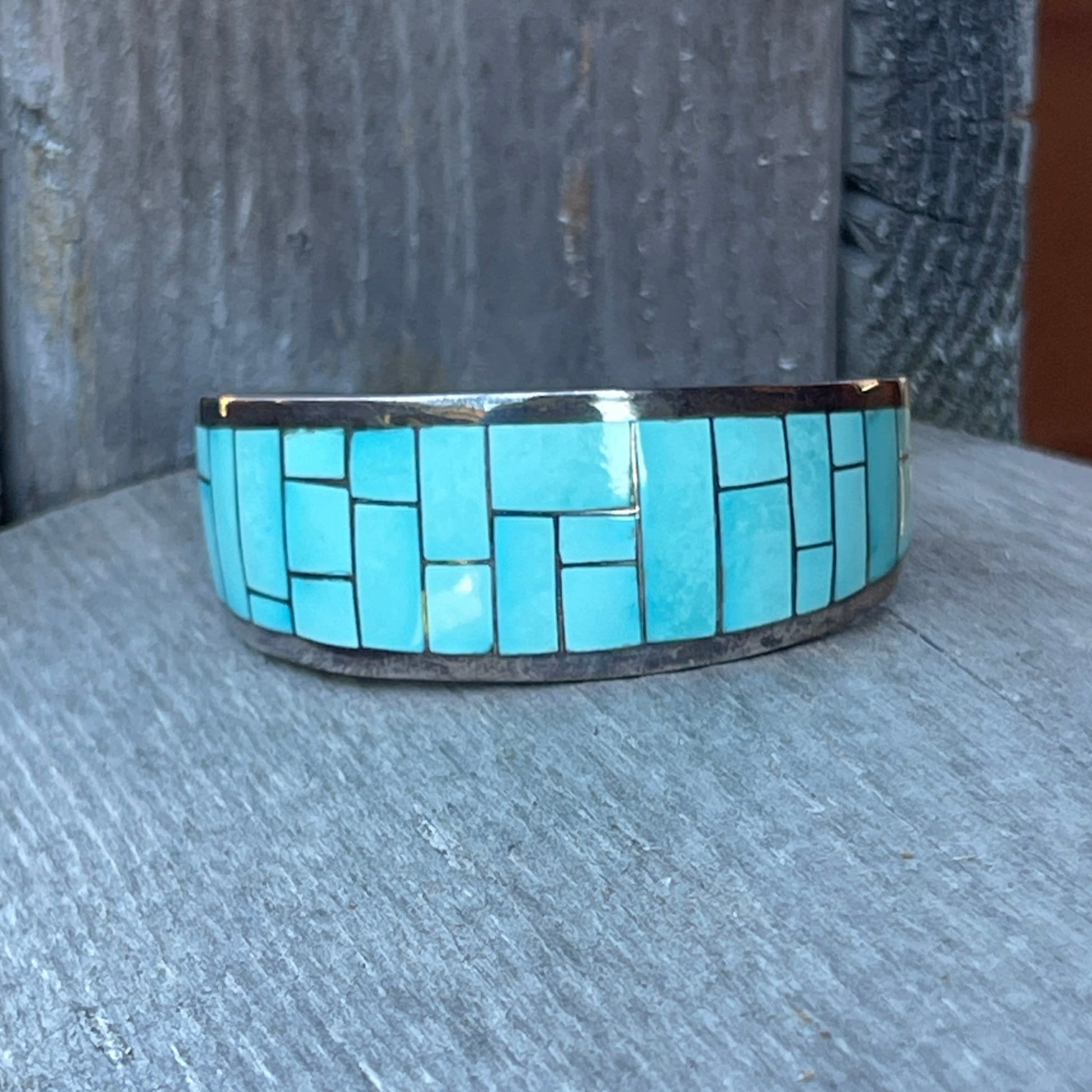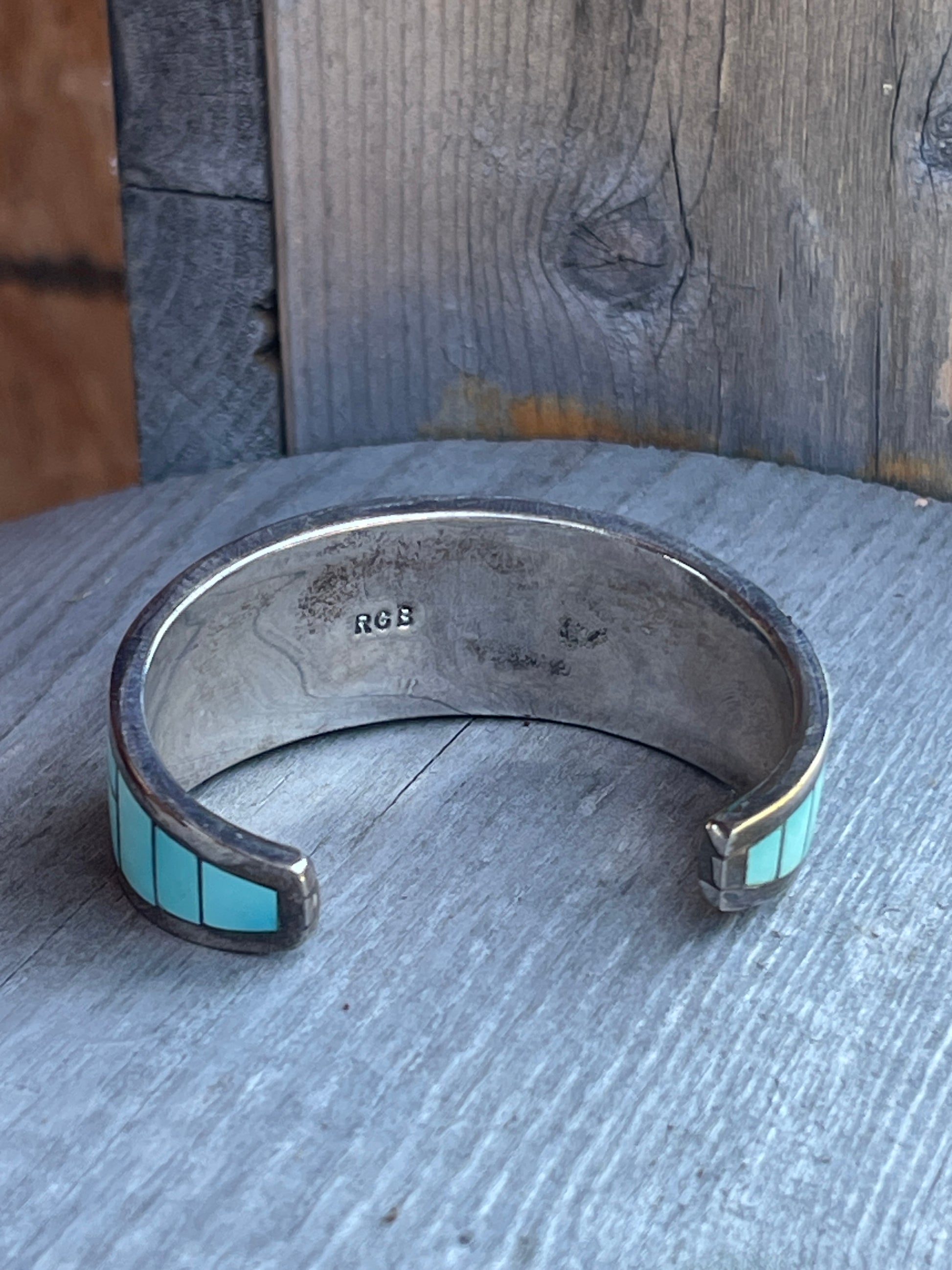 A beautiful Zuni inlay cuff marked RGB by Rickell & Glenda Booqua. It is made from sterling silver, and turquoise. The cuff measures approximately 5 3/4" .
