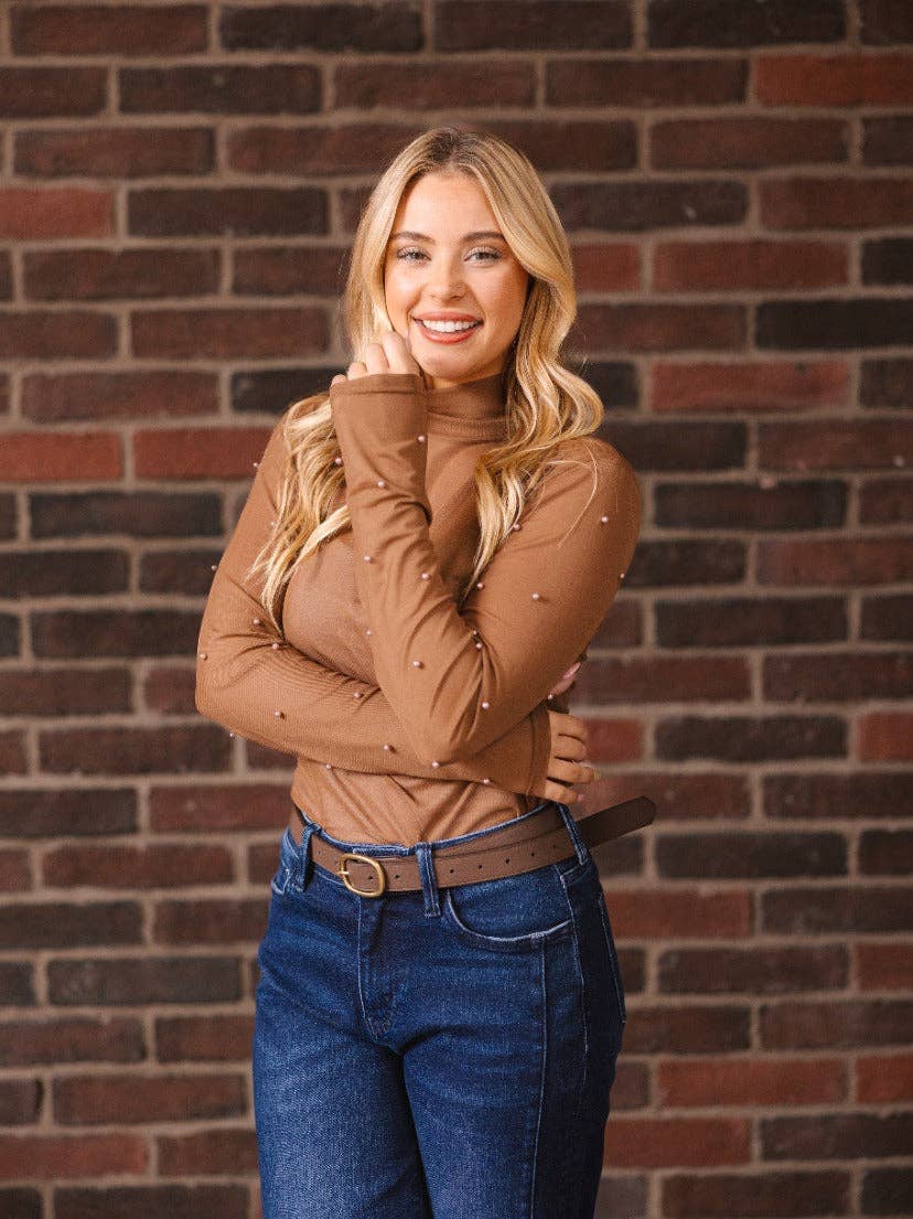 From GRACE+EMMA, the Mock Neck Mesh Top with Pearl Detail in a rich brown hue is a testament to our ethos of blending timeless style with contemporary trends. This knit top for women, meticulously designed, embodies confidence and compassion, mirroring our brand's mission. It's more than a clothing piece - it's a celebration of women's strength, individuality, and elegance. So whether you're attending a community event or enjoying a coffee date, let this top be part of your journey.